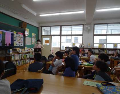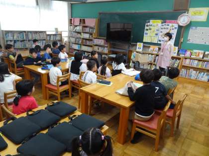 図書館の使い方や使うときのお約束などを改めて確認し、絵本の読み聞かせをしていただきました。