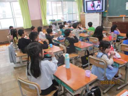 みんなで歯磨きの動画を見ながら、上手に歯磨きをすることができました。
