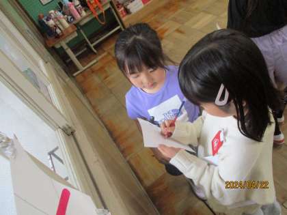画用紙に自分の名前と好きなものの絵を描き、友達に紹介しました。