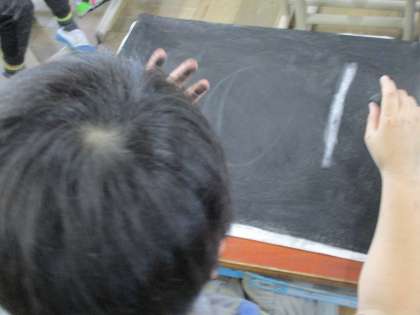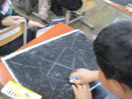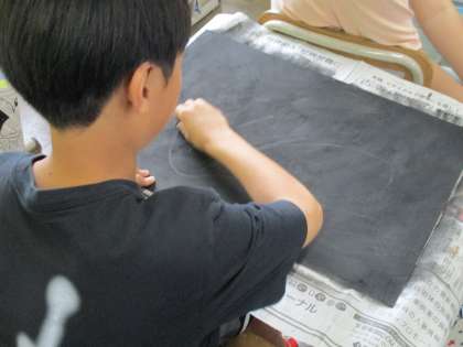 図画工作で「消してかく」の学習を行いました。白い画用紙に黒のコンテで塗りこんだあと、消しゴムで消して色々な形を表現していきました!
