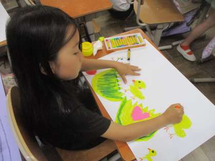 たまごから何が生まれるかを想像して絵を描きました。たまごの中から生まれてくる生き物を想像して作品に表現することができました。