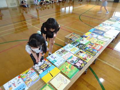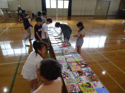 体育館にたくさんの本が並んであり、図書室に置いてほしい本を一人一人選びました。