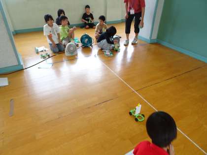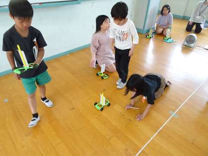 理科の時間に、車に風を当てて走らせる実験をしました。