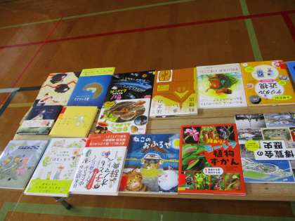 本屋さんに来ていただき、体育館に絵本や図鑑などたくさんの図書を並べてもらいました。