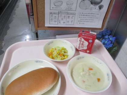 給食のクリームシチューは小麦粉・バター・脱脂粉乳を使って手作りでルーを作っています。まったりとおいしいルーで煮込んだクリームシチューはおかわりもたくさんしていました。