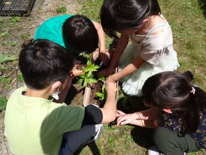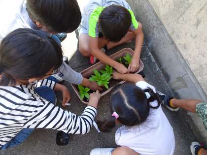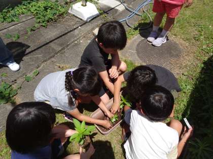 理科の時間に、ホウセンカをプランターへ植え替えました。