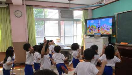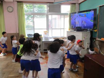 動画を見ながら、音楽に合わせて体を動かしています。