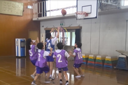 体育科の学習ではバスケットボールの学習を進めています。どうやってボールを運ぶかの作戦を考えたり、ポジションを工夫したりしながら、チームで協力して試合を進めています。