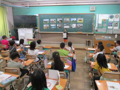 これまで学校の中をたくさん探検してきました。今日はこれまでに探検した場所の中で、自分の1番のお気に入りを紹介しました。絵を見せながら大きい声で発表しました。