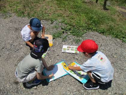 生活科の学習で夏探しに行きました。学校にも夏の植物がたくさんあり子どもたちはお気に入りの夏の植物を観察カードに描きました。