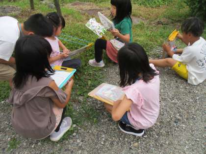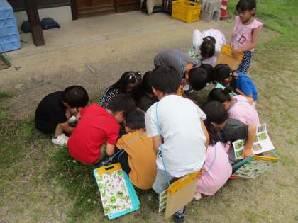 生活科の学習で学校の中の夏の植物を探しにいきました。シロツメクサを見つけると四つ葉探しがはじまり、たくさんの子が見つけていました。中には5つ葉を見つけた子もいました。すごい観察力です。
