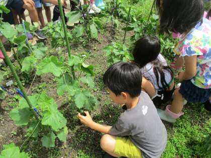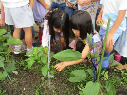 今日は1組も2組も収穫できる野菜があったのでみんなで収穫にいきました。収穫の瞬間はドキドキワクワク。まだまだ取れそうな小さな実がたくさんありますので、今後が楽しみです。
