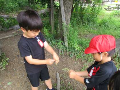 今日は夏の植物を使って遊びました。教科書にのっている遊びや自分たちでオリジナルの遊びを考えたりして遊びました。