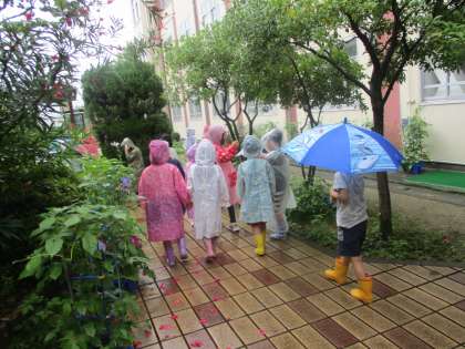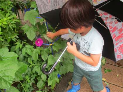 アサガオの花が咲いていたり、カエルがいたり、雨の日ならではの発見をしていました。