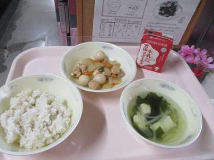 プリプリちゅうかいためはうずらたまごやこんにゃくなどのプリプリした食感が大人気の献立です。
