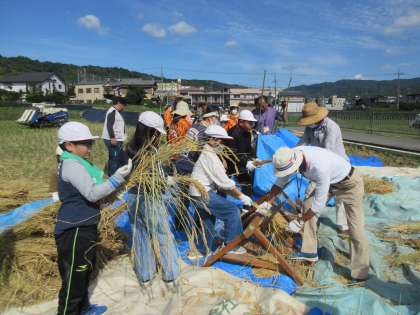 稲刈りに続き、本日は脱穀でした。千歯こきと足踏み脱穀機を使って脱穀を行いました。素晴らしい体験をさせていただき、お米作りの大変さを学ぶことができました。ありがとうございました。