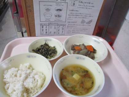 きょうはなごみこんだてです。ぎゅうにくとごぼうのにつけは牛肉とにんじん,旬のごぼうを使用ししょうゆであまからくにつけました。