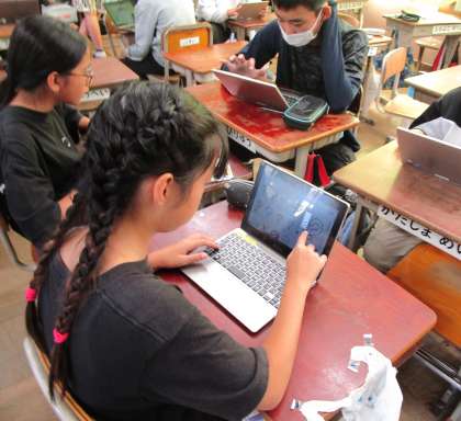 総合的な学習の時間では、1年生に向けて「防災」をテーマに発表をしようと調べた内容をまとめています。1年生は、クイズのほうがいいかな?この内容ではわかりにくいかな?と相手意識をもって話を進めています。