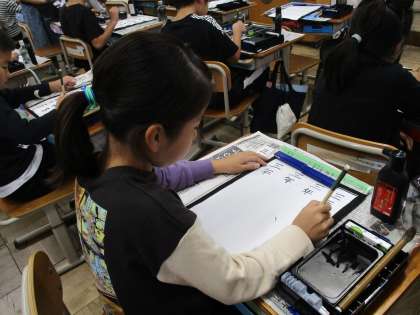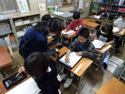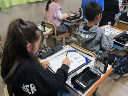 書写の時間に、初めて小筆の練習をしました!大筆の時と違って、力の入れ具合にとても注意しながら名前を書いていました。