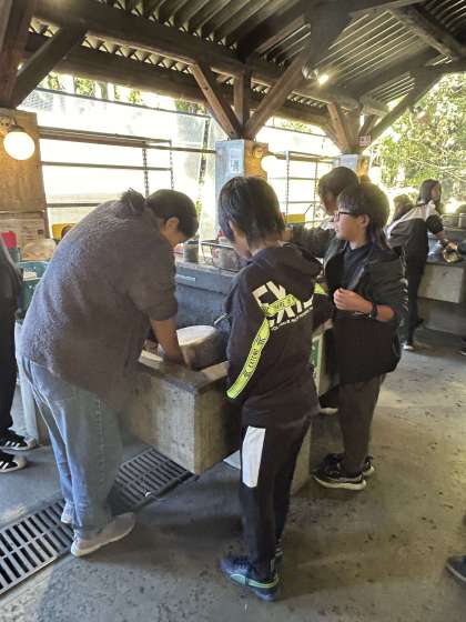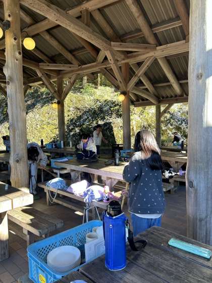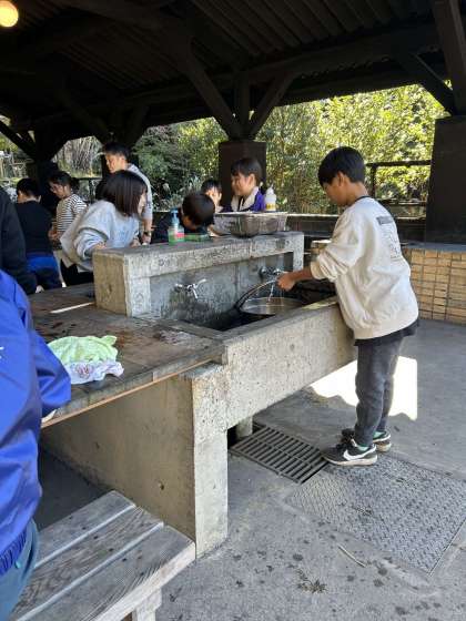 おいしくいただいた後は片付けです。中でも真っ黒になった鍋を洗う作業に苦戦していますが、寒い中がんばってきれいにしています。