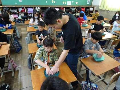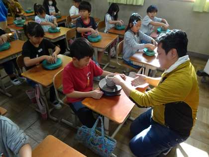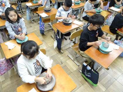 今日の1、2時間目に清水焼団地協同組合の方々に来ていただき、清水焼のお茶碗づくりを体験させていただきました!
