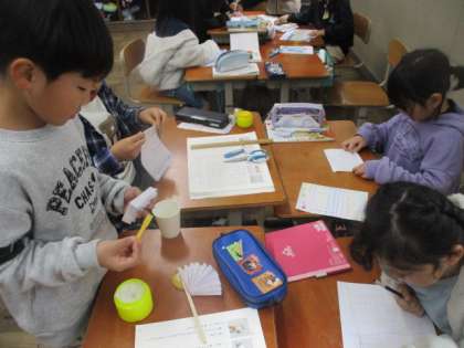 教科書をよく読んで紙コップ花火を作りました。説明の工夫を見つけながら紙コップ花火を作る姿がたくさん見られました。