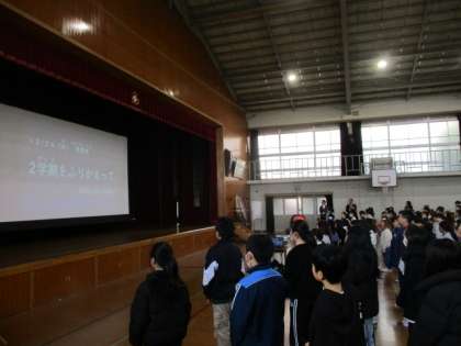 式では、12月に全校で取り組んだなかよし月間での「ぽかぽかどどっこ」を取り上げて話をしました。してもらったり言ってもらったりしてうれしかったこと、心が温かくなったことを、ハート形の色紙に書いて、各学年の廊下に貼ってもらいました。どのメッセージも見ているだけで心が温かくなるようなものばかりでした。メッセージのような心の通い合いが全校に広がれば、みんなが楽しい学校につながると思いました。3学期もみんなが楽しい学校になるように、教職員と子どもたちで取り組んでいきたいと思います。