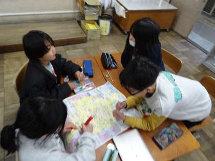 今日は校区の地図を見て、どんなところが危ないかについて考えました。