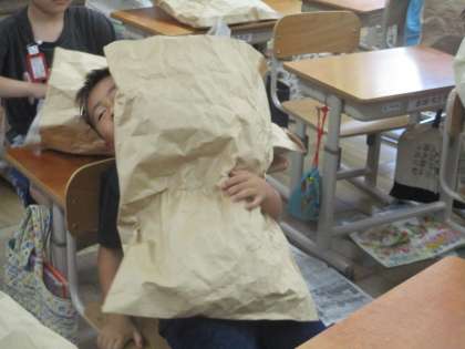 大きな紙をくしゃくしゃして、その中に新聞紙を詰め込んだものを、ぎゅっと抱きしめて、感じたことや思ったことを思い思いに表現しました。