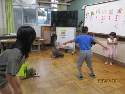 どの遊びをやりたいのか意見を比べ、選んだ「だるまさんがころんだ」「なんでもバスケット」をしました。上手に自分の意見を伝え、友だちの意見も聞くことができました。