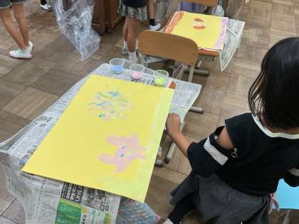 とろとろえのぐの感触を楽しみながら、指の使い方を変えたり、色を混ぜてみたり、大胆にてのひらで絵を描いたりと思い思いの描き方で表すことができました。
