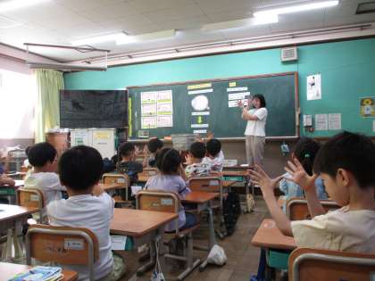 視力検査の前に養護教諭の新川先生から、目を疲れさせないためにすべきことや、疲れたときの対処法などを教えてもらいました。