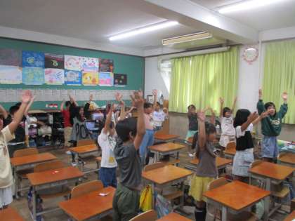 教室でラジオ体操の練習をしました。体全体を大きく曲げ伸ばしすることを意識して取り組みました。