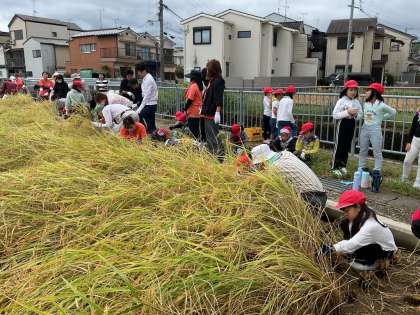 日頃より本校教育にご理解、ご協力いただき、ありがとうございます。地域の方がお世話をしていただいている田んぼで,本日、百々パトロールの方々、PTA本部をはじめ、保護者の方々のご協力により「稲刈り」を無事に行うことができました。虫を怖がり、恐る恐る田んぼに入ってくる子もいましたが、やり終えると「楽しかった。」「もっとやりたかった。」「早く上手に刈れたね、と褒めてもらった。」等、うれしい感想がたくさん聞こえてきました。このような体験を通して子どもたちはもちろん、私たち大人も学ばせていただくことが多く、貴重な体験となりました。ご協力いただいた皆様、ありがとうございました。来週は「脱穀」です。また、たくさんお世話になるかとは思いますが、よろしくお願いいたします。
