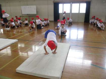 先週の体育では、マットあそびをしました。