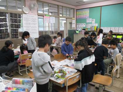 今日は2組でボンドや飾りの材料を使って飾り付けをしました。