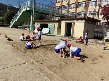 はばとびで、とんだ友達の距離をメジャーで測っています。