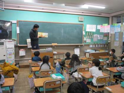 朝学習の時間に読み聞かせがありました。今日は、1組には4年生の西村大輔先生、2組には養護教諭の新川広夢先生がきて絵本を読んでくれました。子どもたちはとても嬉しそうな笑顔で絵本を楽しんでいました。