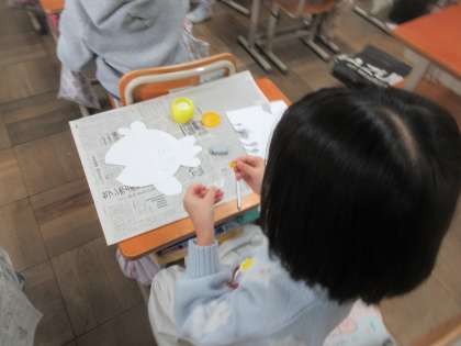 体の基本の部分とひれ、うろこなどの模様を組み合わせながら、思い思いの魚を考えて作品に表そうと頑張っています。子どもたちの自由な発想でたくさんの面白い魚ができてきています。