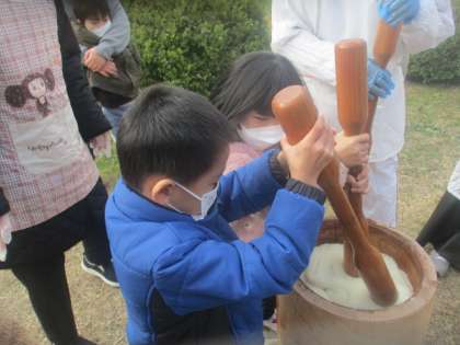 地域の方、保護者の方にお手伝いいただき、もちつきをしました。石臼や杵に触れ、一生懸命に取り組んでいました。