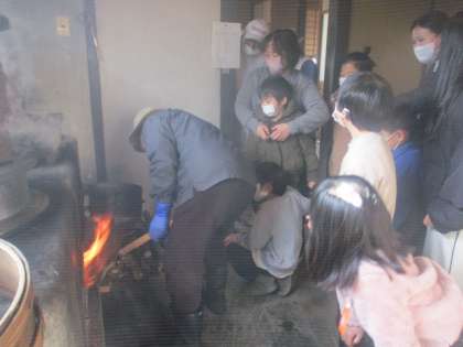 ふるさとの家では、もち米を蒸している様子を見ました。火の温度は800度だということを知り驚いている子どもたちでした。質問もたくさんしました。