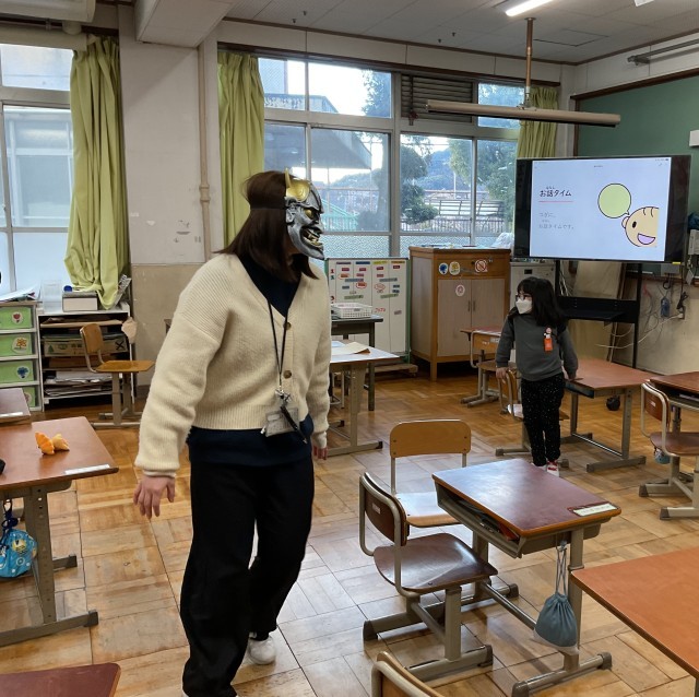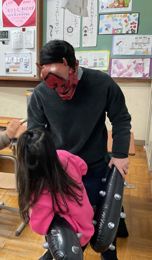 2月3日は暦の上では、冬と春の季節の変わり目です。きららの教室にも”鬼”が来ました。朝会でもお話があった、「心の中の鬼」を追い払うことができたのでしょうか。鬼を追い払う子、逃げ隠れる子と様々でした。
