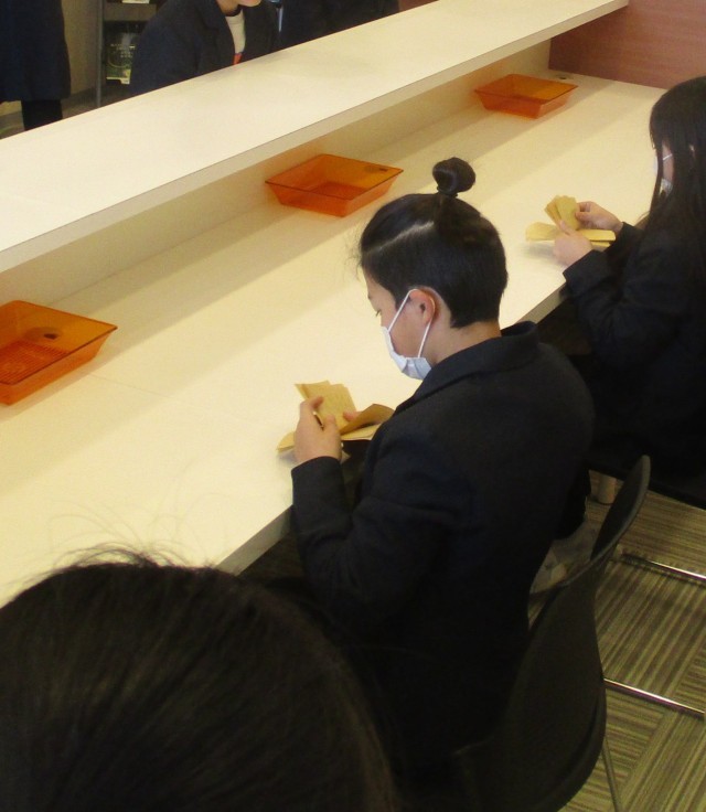 銀行で預金の窓口業務やコンサルティング業務を体験しました。思いやりのある言葉遣いを心掛け、社会の仕組みを学びました。警備会社のブースでは、自動で危険を知らせてくれたり、館内案内をしてくれるAIに「すごい!」「便利だね」と感想をもっていました。未来の社会を支える技術にふれることができました。