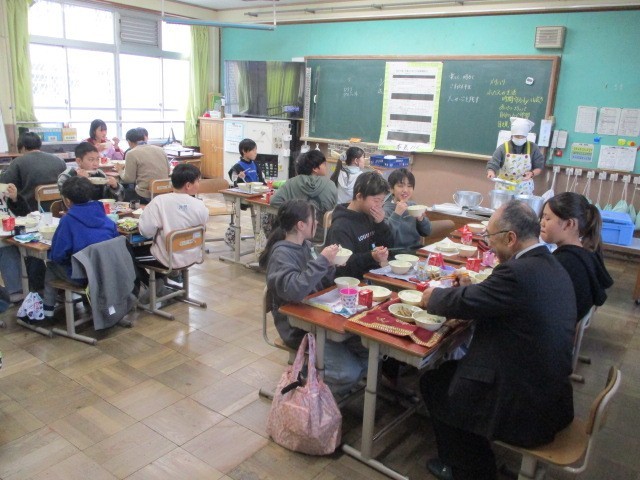 給食室で給食当番がおかずやご飯を運んでいる様子を参観されたり、1年生や6年生と給食を食べたりしていただきました。
