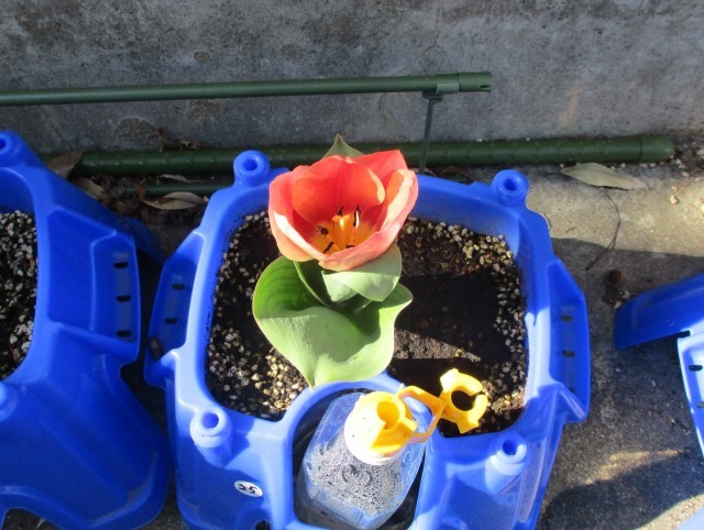 ぽかぽか陽気に春を感じたのか子どもたちが育てていたチューリップの第1号が咲きました。