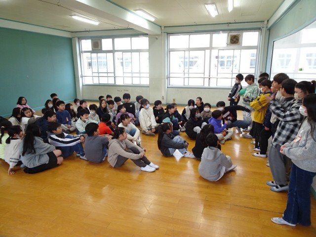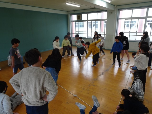 各クラスで行う時間だけでなく、学年みんなで遊ぶ時間もとりました。あいにく雨だったので室内で「ころがしドッジ」と「じゃんけん列車」をしました!