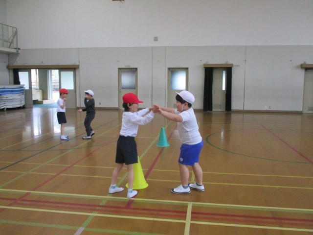 しっかりと並ぶ練習や「ドン・ジャンケン」、先頭になったお友達の真似をして端っこまで移動する「まねっこあそび」をしました。