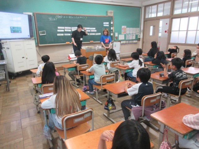 学習後半にはALTのカーリー先生のクイズにみんなで答えながら外国語に触れる活動を楽しむことができました。