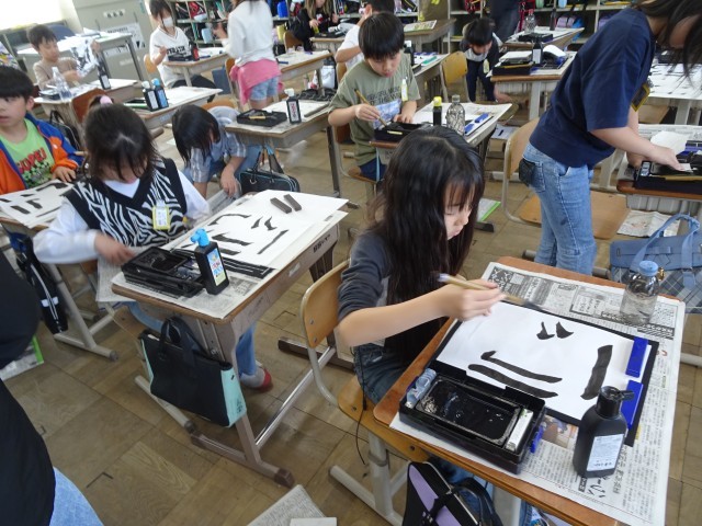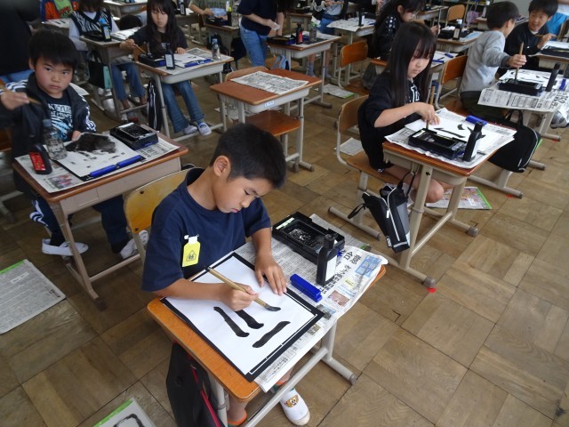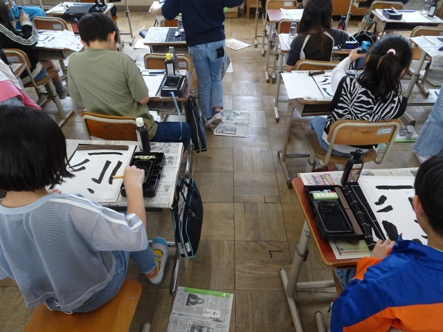 久しぶりの毛筆書写の学習だったので、用具の名前や置き方、使い方などについて確認し、たて画や横画、はらい、曲がり、折れなどの練習をしました!