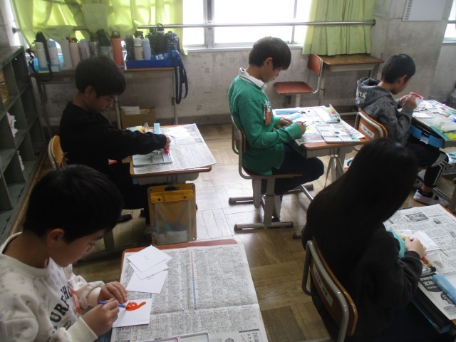 5年生で初めての作品は「心のもよう」これまでにやってきた技法を使って思いのままに描きました。